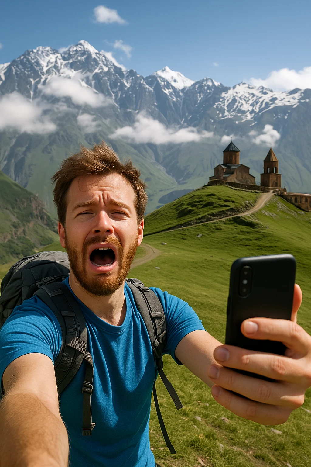 سائح يتعب من صعود جبل كازبيجي ويلتقط سيلفي أمام كنيسة غيرجيتي في جورجيا، مشهد فكاهي يعكس روح المغامرة في دليل السفر إلى جورجيا في الصيف