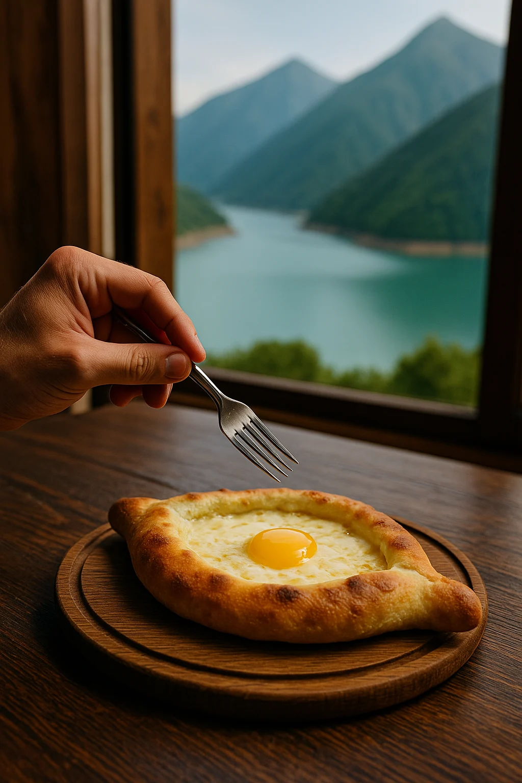 خاشابوري جورجي طازج أمام نافذة تطل على الجبال، ضمن تجربة الطعام في دليل السفر إلى جورجيا في الصيف