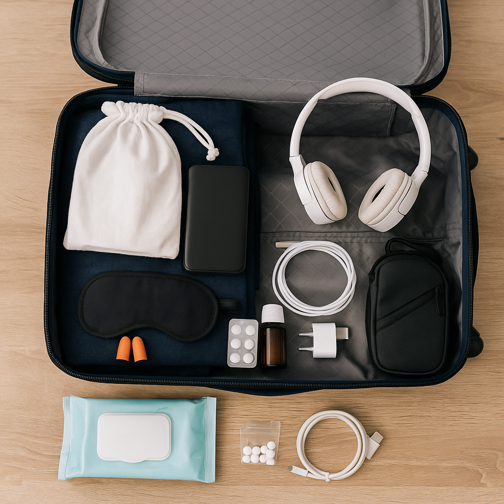 وليس النوم فقط، بل أيضاً لحظات التأمل أو الراحة في المطار، عندما تكون بحاجة للهروب من ضجيج الأطفال أو الإعلانات المستمرة. اختر سدادات ناعمة ومريحة، وقناعًا لا يضغط على العين، واحملهما في الجيب الخارجي للحقيبة.