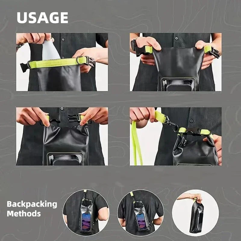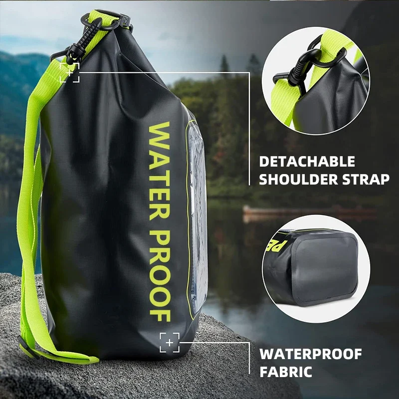 “استعد للمغامرة مع حقيبة كتف PVC المقاومة للماء بسعة 5 لتر – مثالية للسباحة، الكاياك، التخييم، وركوب القوارب.
